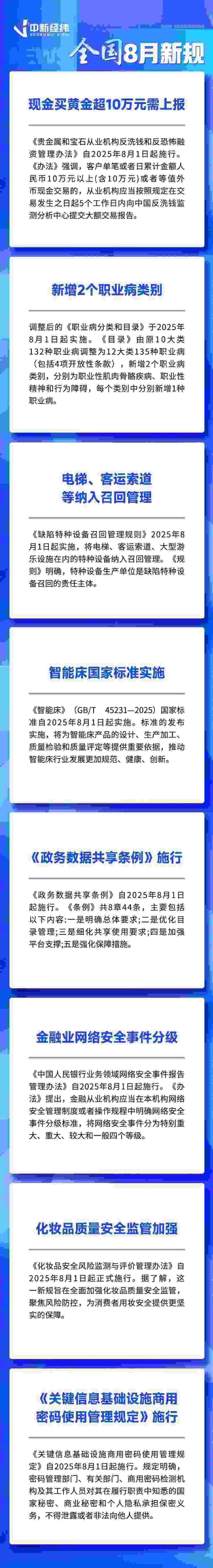 中新經(jīng)緯7月30日電 (熊思怡)現(xiàn)金買黃金超10萬元需上報、新增2個職業(yè)病類別、北京取消餐飲經(jīng)營場所面積限制……8月,這些新規(guī)事關(guān)你我,一起來看。