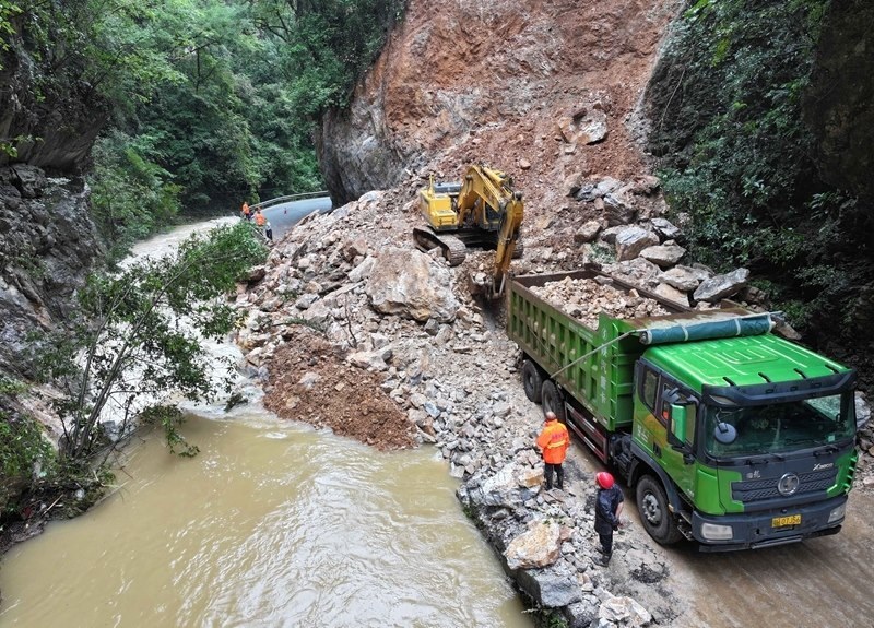 8月10日,在??悼h馬橋鎮(zhèn)堯(治河村)馬(橋鎮(zhèn))路6.2公里處,大型工程機(jī)械處置路旁崩塌的巖石(無人機(jī)照片)。
