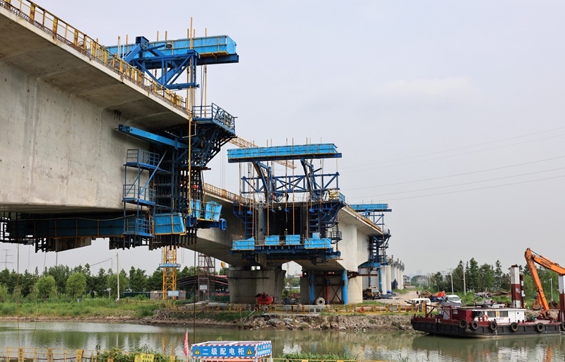 8月12日拍攝的滬寧合高鐵上海特大橋跨羅蘊河連續(xù)梁施工現場(無人機照片)。