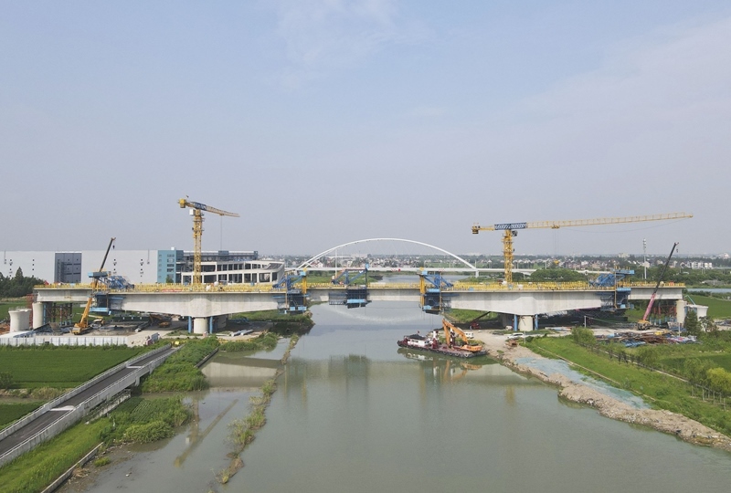 8月12日拍攝的滬寧合高鐵上海特大橋跨羅蘊河連續(xù)梁施工現場,上側為完成合龍的滬通鐵路二期太徐特大橋跨羅蘊河連續(xù)梁施工現場(無人機照片)。