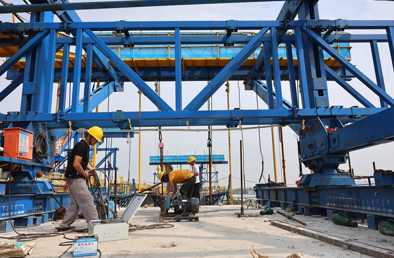 8月12日,工人在滬寧合高鐵上海特大橋跨羅蘊河連續(xù)梁澆筑作業(yè)面施工。