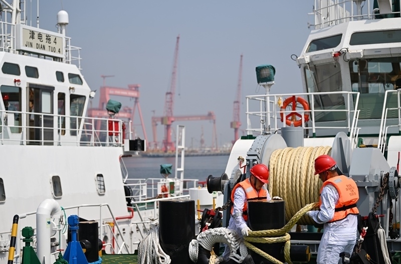 8月13日,由4艘純電動港作拖輪組成的“綠色艦隊”在中船天津碼頭鳴笛啟航。