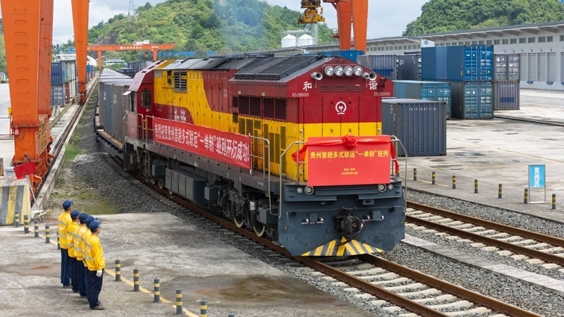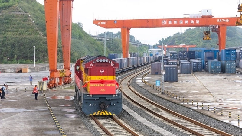 8月19日,貴州首趟多式聯(lián)運(yùn)“一單制”班列從貴陽國際陸港都拉營站出發(fā)(無人機(jī)照片)。