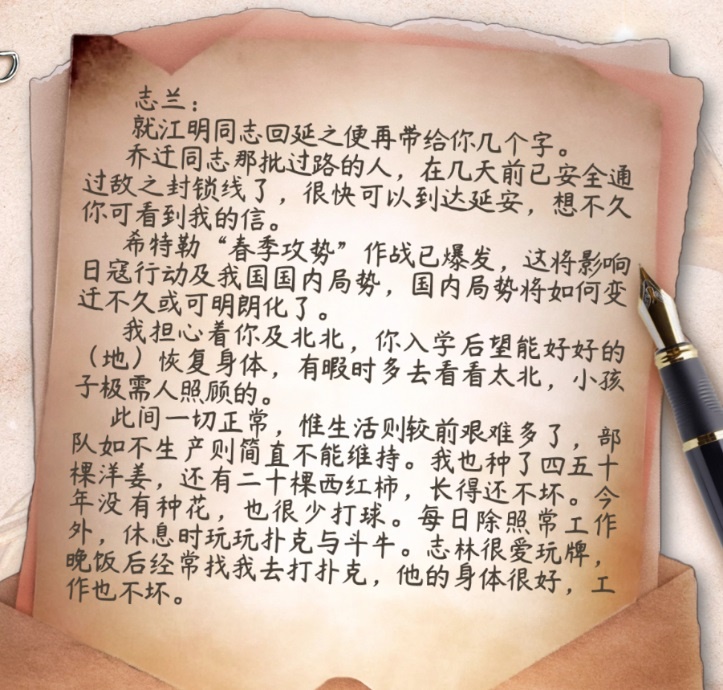 5月22日,日軍離八路軍總部只有十幾公里了,在這樣一個危急時刻,得知有人要去延安,左權決定給妻子劉志蘭寫一封信,回答她的問題。