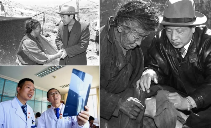 左上圖為來(lái)自陜西的援藏干部、阿里日土縣副縣長(zhǎng)賈冗勇深入牧區(qū),幫助藏族牧民解決生產(chǎn)、生活的實(shí)際困難(新華社記者土登攝,1997年11月11日發(fā));左下圖為2017年8月3日,北京積水潭醫(yī)院援藏醫(yī)生龔曉峰(右)和北京天壇醫(yī)院援藏醫(yī)生李家謀在拉薩市人民醫(yī)院骨科病房?jī)?nèi)查看患者的X光片(新華社記者晉美多吉攝);右圖為孔繁森(右)在阿里日土縣過(guò)巴鄉(xiāng)為孤寡老人益西卓瑪治病(新華社記者土登攝,1994年12月26日發(fā))。