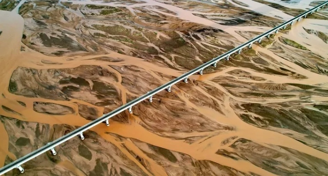 青藏鐵路跨過(guò)沱沱河的辮狀河道(2023年7月26日攝,無(wú)人機(jī)照片)。新華社記者 劉詩(shī)平 攝