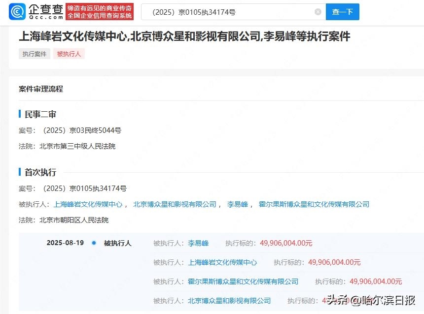 8月21日,記者從企查查獲悉,近日,李易峰、上海峰巖文化傳媒中心、北京博眾星和影視有限公司等被北京市朝陽區(qū)人民法院強(qiáng)制執(zhí)行約4990萬元。其中,上海峰巖文化傳媒中心成立于2018年,由李易峰個(gè)人出資。