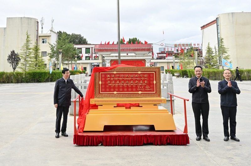 8月23日上午,受習(xí)近平總書記囑托,帶著黨中央的親切關(guān)懷和全國人民的深情祝福,中央代表團部分成員在日喀則看望慰問各族干部群眾。這是王滬寧和中央代表團部分成員向日喀則市贈送賀匾。新華社記者 殷博古 攝