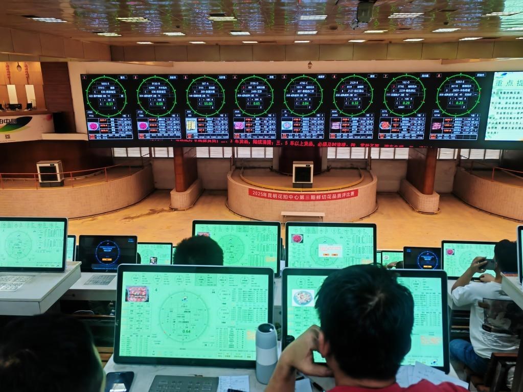 記者在昆明國際花卉拍賣交易中心看到,拍賣大鐘界面顯示著各種花卉的信息,數(shù)百名購買商操作著競價器選購鮮花。昆明國際花卉拍賣交易中心副總經(jīng)理汪洋介紹,這里每天的鮮花交易量都超700萬枝,單日最高交易量超1100萬枝,30%以上的鮮花被各大電商和直播團(tuán)隊拍下,他們再拿到電商平臺或直播間銷售。
