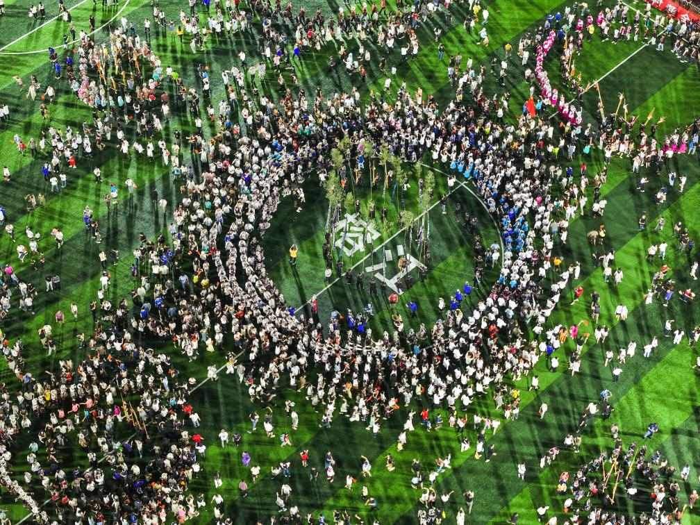 8月23日,人們在貴州“村超”球場跳苗族蘆笙舞(無人機照片)。新華社記者 楊文斌 攝