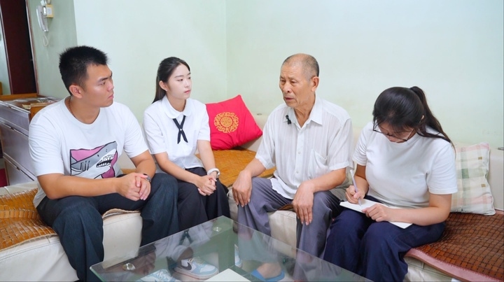 楊村幸存村民王玉璽向?qū)ぴL團(tuán)比劃當(dāng)年嘴部中彈的經(jīng)過(guò)