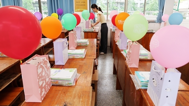 8月30日,江蘇省連云港市解放路小學(xué)老師在布置教室、分發(fā)課本。