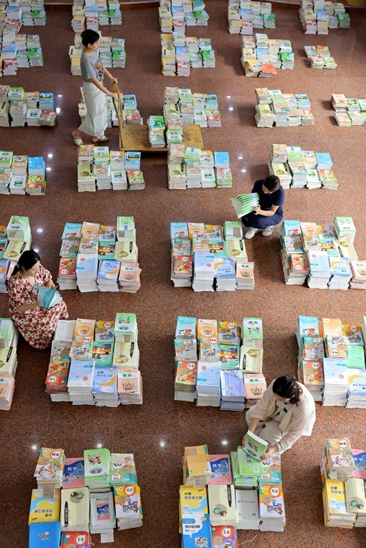 8月30日,山東省棗莊市市中區(qū)文化路小學(xué)老師在清點(diǎn)新學(xué)期教材。