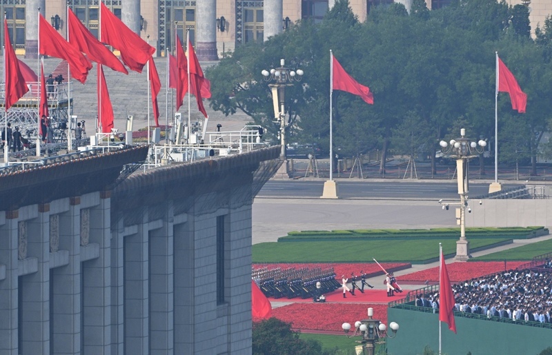 9月3日,紀(jì)念中國(guó)人民抗日戰(zhàn)爭(zhēng)暨世界反法西斯戰(zhàn)爭(zhēng)勝利80周年大會(huì)在北京隆重舉行。這是國(guó)旗護(hù)衛(wèi)隊(duì)官兵護(hù)衛(wèi)著五星紅旗行進(jìn)。