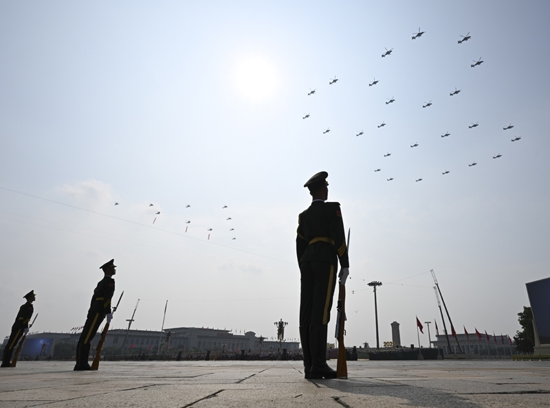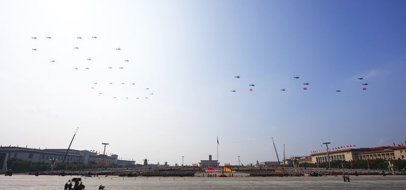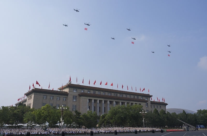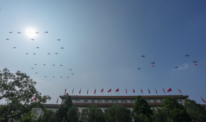 9月3日,紀(jì)念中國(guó)人民抗日戰(zhàn)爭(zhēng)暨世界反法西斯戰(zhàn)爭(zhēng)勝利80周年大會(huì)在北京隆重舉行。這是空中護(hù)旗梯隊(duì)飛過(guò)天安門(mén)廣場(chǎng)上空,26架直升機(jī)匯成巨大的“80”字樣。