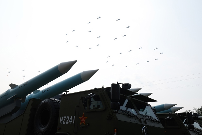 9月3日,紀(jì)念中國人民抗日戰(zhàn)爭暨世界反法西斯戰(zhàn)爭勝利80周年大會在北京隆重舉行。這是空中護旗梯隊從反艦導(dǎo)彈方隊上空飛過。