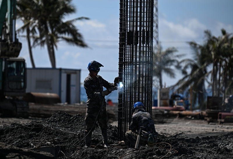9月5日,工人在海南商業(yè)航天發(fā)射場(chǎng)二期項(xiàng)目四號(hào)發(fā)射工位施工。