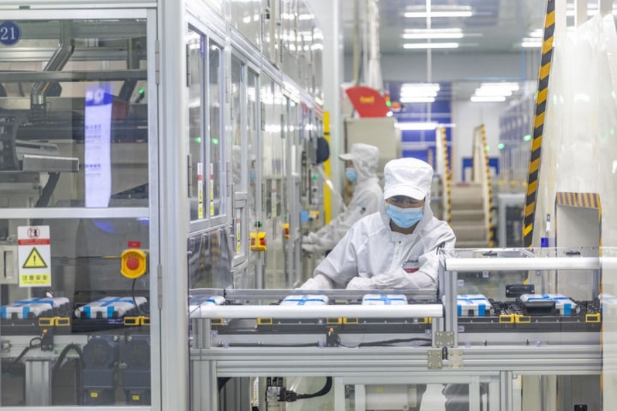 2024年9月27日,在位于重慶市銅梁區(qū)的海辰儲(chǔ)能重慶制造基地,工作人員在生產(chǎn)線上初步檢測兩個(gè)電芯是否配對。新華社記者 黃偉 攝