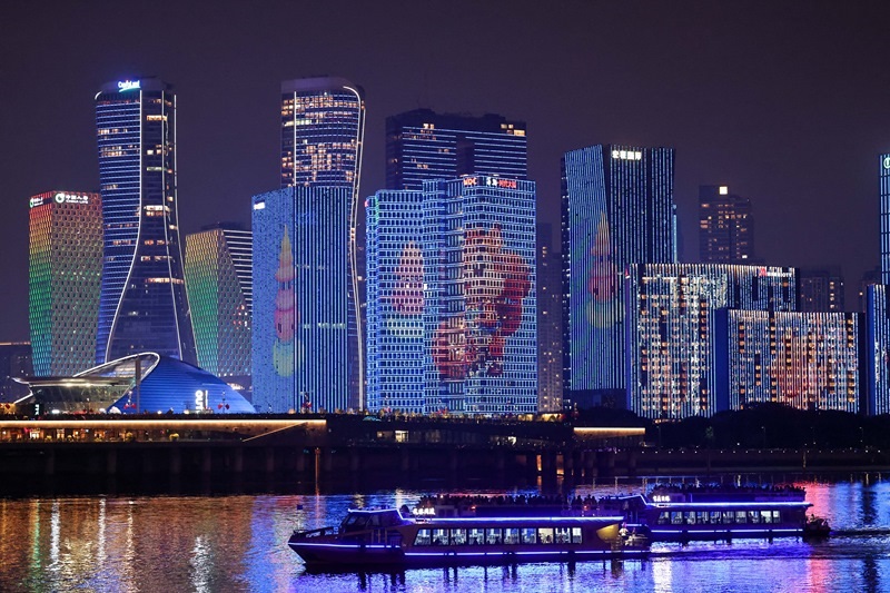 10月2日,游客在觀賞杭州錢塘江沿岸夜景。