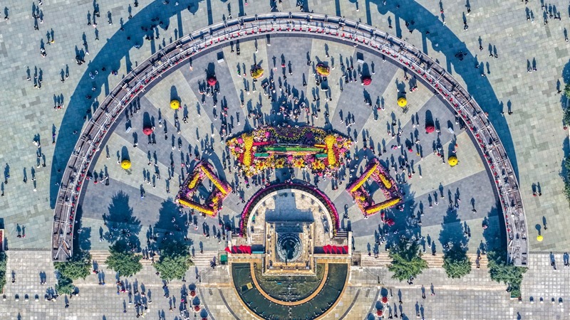 10月2日,游客在黑龍江省哈爾濱市防洪勝利紀(jì)念塔廣場(chǎng)游玩(無人機(jī)照片)。