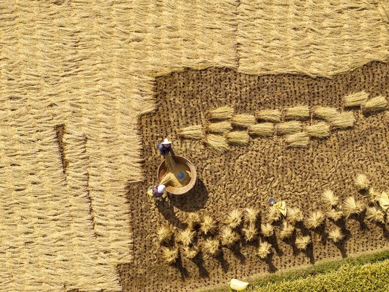 10月3日,農(nóng)民在云南省大理白族自治州洱源縣右所鎮(zhèn)收割水稻(無人機(jī)照片)。