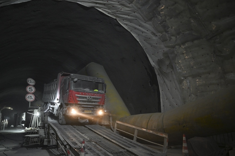 施工車輛行駛在昭溫公路西天山特長(zhǎng)隧道右洞內(nèi)(10月5日攝)。