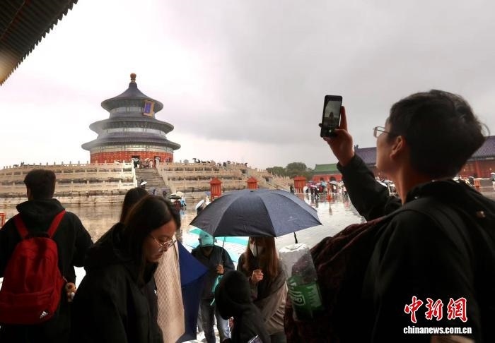 10月8日,今年國(guó)慶中秋假期最后一天,游客在天壇公園游覽拍照。中新社記者 易海菲 攝