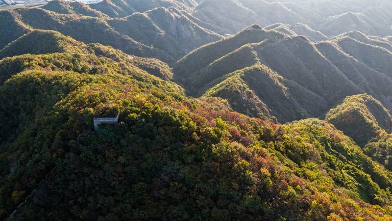 10月18日在河北省唐山市遷西縣上營鎮(zhèn)拍攝的青山關(guān)長城秋景(無人機(jī)照片)。