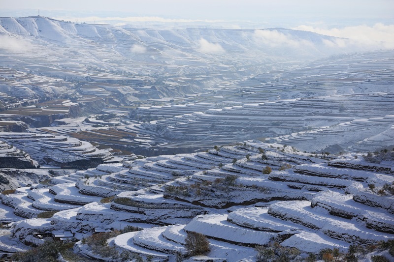 這是10月17日在甘肅永靖縣陳井鎮(zhèn)拍攝的雪后梯田(無人機(jī)照片)。