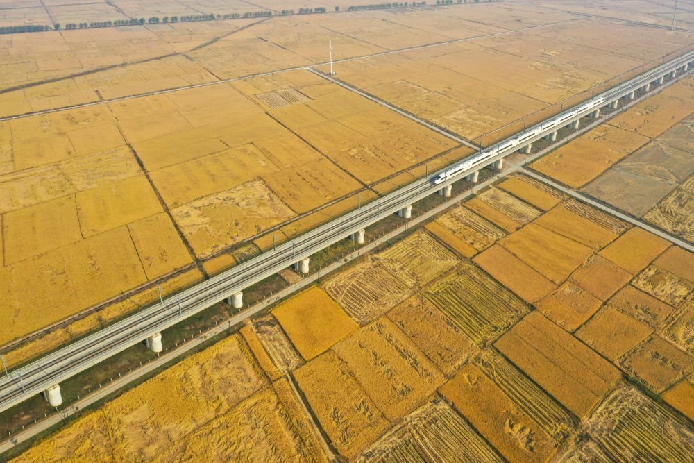 10月14日,在吉林省公主嶺市,一列高鐵列車沿著田間的鐵路線穿行(無人機照片)。2025年,吉林省深化農(nóng)機研發(fā)、制造、推廣、應(yīng)用一體化試點示范,農(nóng)作物耕種收綜合機械化率達94.6%。新華社記者 張楠 攝