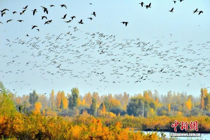 中新網(wǎng)烏魯木齊10月28日電 (黨艷麗)深秋時節(jié),成群結(jié)隊的灰雁“到訪”新疆可克達(dá)拉市。它們或飛翔在湛藍(lán)的天空上,發(fā)出陣陣鳴叫聲;或集結(jié)在伊犁河可克達(dá)拉市段河畔,補給“能量”,為接下來的遷徙旅程做足準(zhǔn)備。