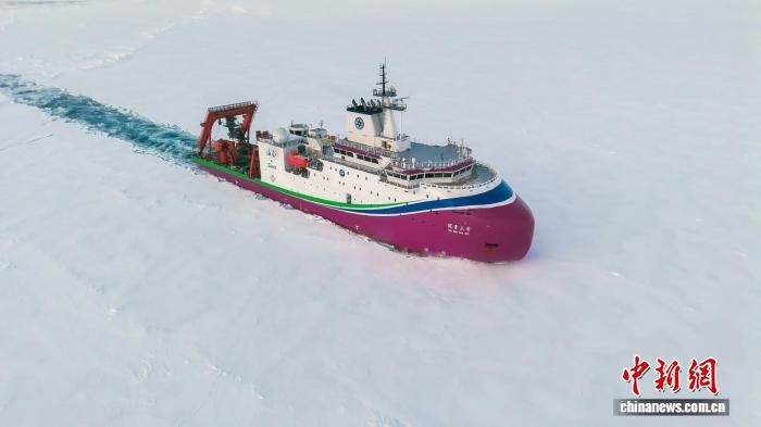 圖為2025年9月,“探索三號(hào)”在北極密集冰區(qū)破冰航行。(中國科學(xué)院深海科學(xué)與工程研究所 供圖)