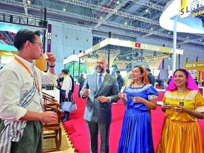 第八屆進(jìn)博會老撾展廳,工作人員邀請薩爾瓦多游客品茶。本報(bào)記者 范天培攝/光明圖片