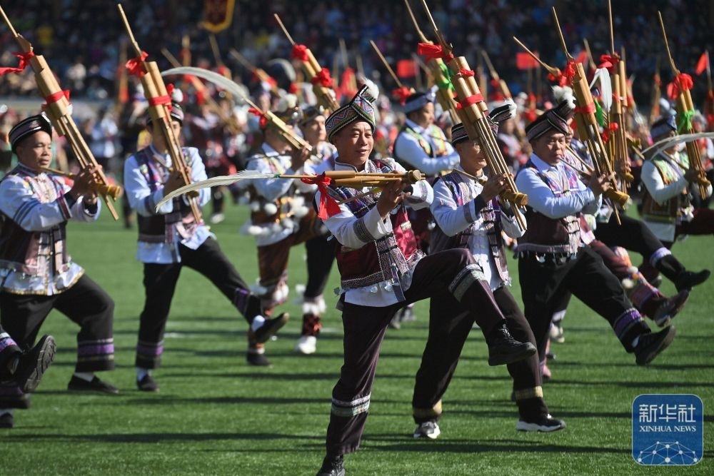 ↑11月29日,表演者在融水縣民族體育公園舉行的蘆笙斗馬節(jié)開(kāi)幕式現(xiàn)場(chǎng)表演。新華社記者 黃孝邦 攝
