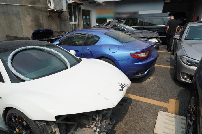 涉案維修廠內存放的事故豪車(央廣網發(fā) 上海警方供圖)