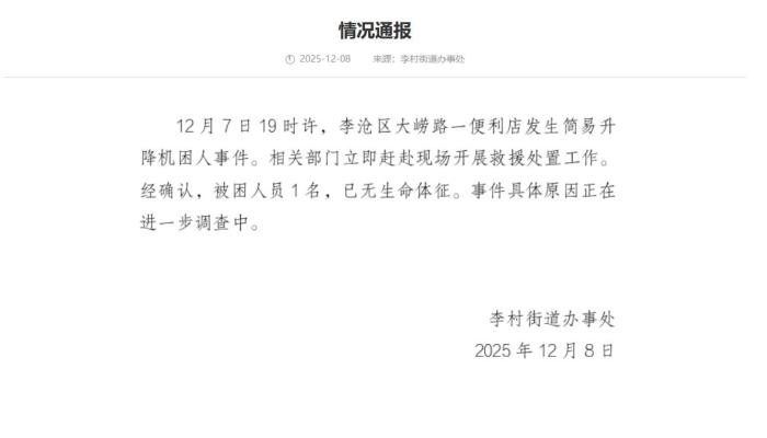 中新網(wǎng)12月8日電 青島李村街道辦事處8日在青島李滄政務(wù)網(wǎng)發(fā)布情況通報(bào)稱,12月7日19時(shí)許,李滄區(qū)大嶗路一便利店發(fā)生簡易升降機(jī)困人事件。相關(guān)部門立即趕赴現(xiàn)場開展救援處置工作。經(jīng)確認(rèn),被困人員1名,已無生命體征。事件具體原因正在進(jìn)一步調(diào)查中。
