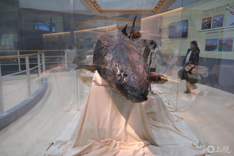 水野中心內科普館的“鎮(zhèn)館之寶”,是一尾中華鱘標本。它長3.5米,重350公斤。2007年7月17日在金山區(qū)杭州灣水域誤入漁網受傷,經全力救治成功存活1232天,在2010年12月1日死亡,創(chuàng)下當時國內搶救救治中華鱘最長存活紀錄 郜陽 攝