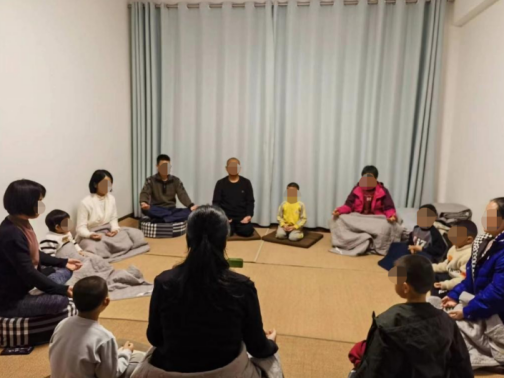 ▲家長(zhǎng)帶著孩子參加“乾源文化”打坐練功