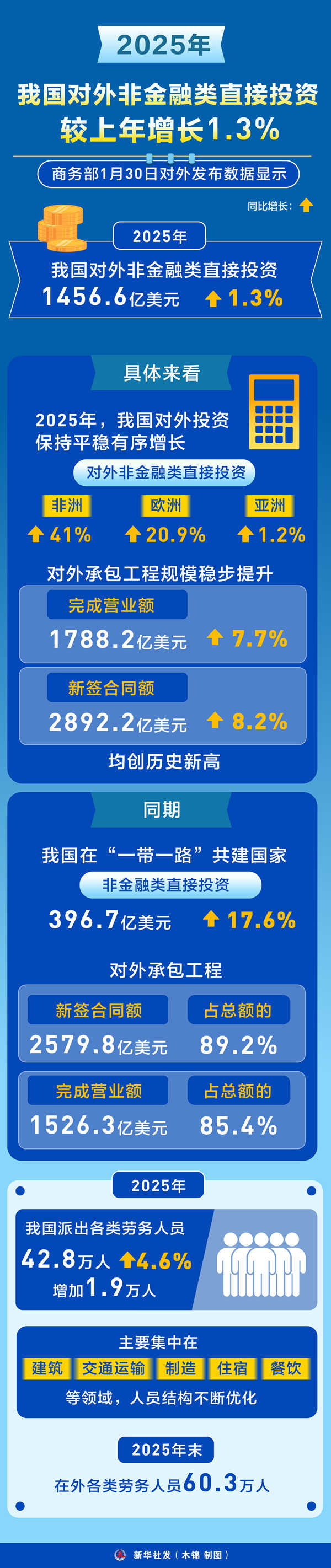 具體來(lái)看,2025年,我國(guó)對(duì)外投資保持平穩(wěn)有序增長(zhǎng),對(duì)非洲、歐洲、亞洲非金融類(lèi)直接投資分別增長(zhǎng)41%、20.9%和1.2%;對(duì)外承包工程規(guī)模穩(wěn)步提升,完成營(yíng)業(yè)額1788.2億美元,較上年增長(zhǎng)7.7%,新簽合同額2892.2億美元,較上年增長(zhǎng)8.2%,均創(chuàng)歷史新高。