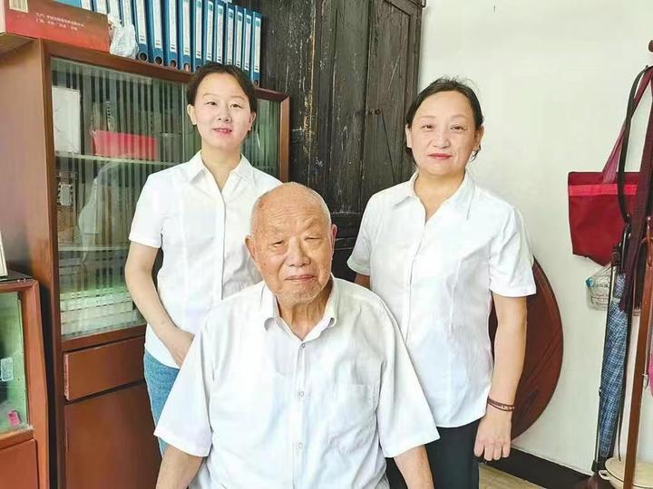 黃岡市級非遺代表性項(xiàng)目“紅色革命歌謠”的代表性傳承人梅仙桃(右)與父親梅基癸、女兒袁曉英合影。(麻城市委宣傳部供圖)
