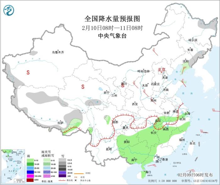 2月9日08時(shí)至10日08時(shí),新疆西北部、西藏東北部和南部、青海北部、甘肅河西、山西中南部、山東大部、湖北西部、湖南西北部、重慶東北部等地部分地區(qū)有小雪或雨夾雪,局地有中雪;貴州東北部、湖南西部等地高海拔山區(qū)有凍雨。江漢東部、江淮、江南及重慶東南部、貴州大部、廣西中部和北部、云南南部、海南島東部、臺(tái)灣島東部等地部分地區(qū)有小雨。新疆東部和南部、青海中東部、內(nèi)蒙古中西部、甘肅中西部、寧夏、陜西北部等地的部分地區(qū)有揚(yáng)沙或浮塵天氣,局地有沙塵暴。新疆北疆東部和南疆山區(qū)、內(nèi)蒙古西部、青海大部、甘肅河西、寧夏大部、西藏西部和北部、川西高原北部等地有5~7級(jí)風(fēng)、陣風(fēng)8~9級(jí);東海南部海域、臺(tái)灣海峽、臺(tái)灣以東洋面、巴士海峽、南海大部海域、瓊州海峽、北部灣將有7~8級(jí)、陣風(fēng)9級(jí)的大風(fēng),其中,巴士海峽、南海東部海域的部分海域風(fēng)力可達(dá)9級(jí)、陣風(fēng)10級(jí)(見(jiàn)圖2)。