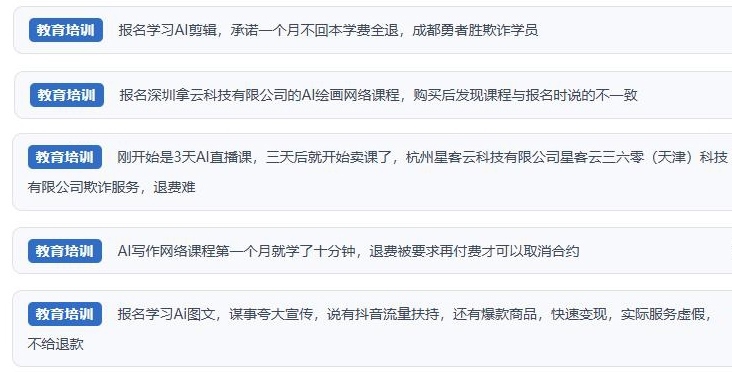 然而,“人民投訴”經(jīng)梳理發(fā)現(xiàn),網(wǎng)絡(luò)上不少消費(fèi)者吐槽相關(guān)課程質(zhì)量良莠不齊,與廣告承諾“免費(fèi)領(lǐng)取AI應(yīng)用體驗課及AI工具”“低投入、高回報”“副業(yè)賺錢”“快速變現(xiàn)”等內(nèi)容大相徑庭。相關(guān)商家虛假宣傳、誘導(dǎo)消費(fèi)、貨不對板以及退費(fèi)難等問題被反復(fù)提及。