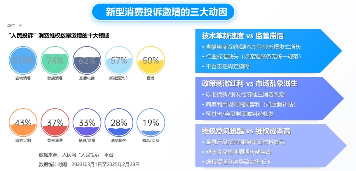 “人民投訴”綜合分析,技術(shù)驅(qū)動新業(yè)態(tài)與監(jiān)管未能同步、政策刺激紅利與市場亂象并存、維權(quán)意識提升與維權(quán)成本矛盾這三大因素共同成為推高新型消費(fèi)領(lǐng)域風(fēng)險的原因。