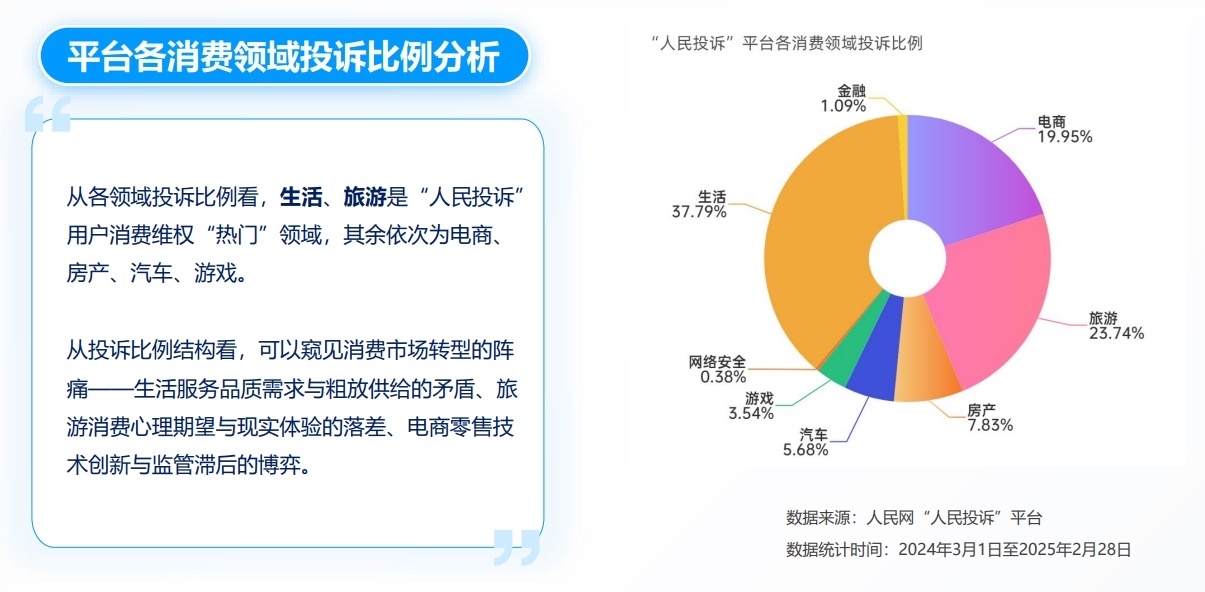 2024年3月1日至2025年2月28日,“人民投訴”用戶投訴量同比增加109%。入駐企業(yè)/機(jī)構(gòu)回復(fù)辦理平臺投訴近3000件。特別是旅游在線平臺、電商平臺、3C家電、定制家居、新能源汽車、網(wǎng)貸保險、快遞、游戲娛樂、票務(wù)、通信服務(wù)等消費(fèi)領(lǐng)域的企業(yè)/機(jī)構(gòu)回復(fù)/辦理投訴較積極,用戶滿意度提升,平臺在線糾紛解決機(jī)制成效顯現(xiàn)。