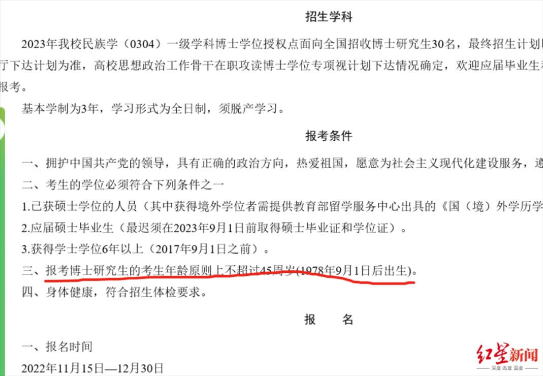而根據(jù)《青海民族大學(xué)2023年民族學(xué)博士研究生招生簡章》,報(bào)考博士研究生的考生年齡原則上不超過45周歲(1978年9月1日后出生)。資料顯示,阿進(jìn)錄為1973年出生。對于網(wǎng)友提到的“年齡不符合報(bào)考條件”,上述工作人員表示:“他資格審查是通過的。”