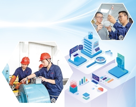 圖①:東港熱電公司博士創(chuàng)新站博士(左)與企業(yè)員工討論實驗反應(yīng)結(jié)果。圖②:東港熱電公司員工(右)帶領(lǐng)參與博士創(chuàng)新站實踐工作的大學(xué)生檢修設(shè)備。