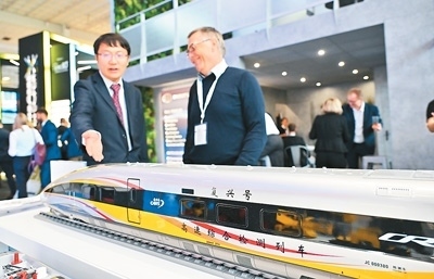 | 日前,在德國柏林軌道交通展上,中國鐵道科學(xué)研究院集團有限公司工作人員(左)向參觀者介紹復(fù)興號高速綜合檢測列車模型。新華社發(fā) |