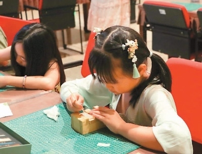 在四層的非遺手工藝體驗(yàn)中心,許多小朋友正在興致勃勃地體驗(yàn)古法制玉、敦煌石粉彩繪技藝(壁畫臨?。?、紙箋加工技藝(流沙箋團(tuán)扇制作)等非遺項(xiàng)目。一位小朋友正在美美地?cái)[弄著自己親手制作的流沙箋團(tuán)扇。她的母親許女士介紹說(shuō),這些項(xiàng)目雖然看著傳統(tǒng)但其實(shí)非常時(shí)尚,孩子很喜歡這些手工項(xiàng)目,覺(jué)得很有趣;帶孩子在博物館里看展覽還能做手工,是一項(xiàng)很有意義的體驗(yàn)。