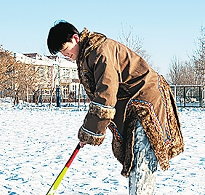 寒假期間,每當(dāng)夕陽的余暉染紅了大地,達(dá)斡爾族人迎新春最傳統(tǒng)的運(yùn)動(dòng)項(xiàng)目——打火球就要拉開序幕。打火球的比賽規(guī)則簡單而有趣,通常選擇平坦的草地或村中開闊的街道作為場(chǎng)地,兩端各設(shè)一個(gè)球門,兩隊(duì)人數(shù)相等即可,以進(jìn)球多者為勝。盡管開始時(shí)我屢屢失誤,但在長輩們的鼓勵(lì)和指導(dǎo)下,我逐漸掌握了技巧,每一次成功擊打都讓我興奮不已。