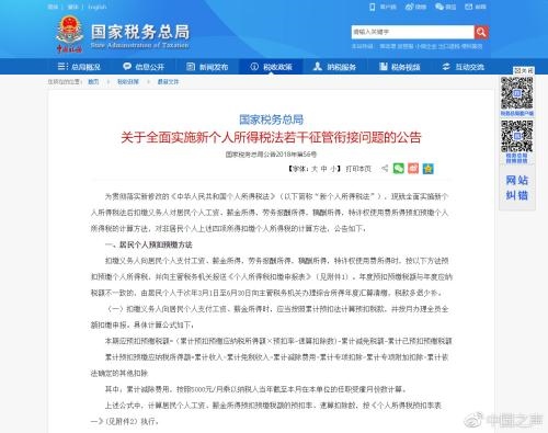 據(jù)中國(guó)之聲《新聞縱橫》報(bào)道:新修改的個(gè)人所得稅法將于2019年1月1日正式實(shí)施。國(guó)家稅務(wù)總局日前發(fā)布公告明確了全面實(shí)施新個(gè)人所得稅法的征管辦法,確保新舊稅制平穩(wěn)過渡。